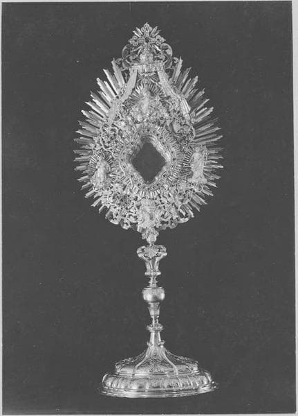 Grande monstrance en argent doré, aux pierres précieuses enchassées (topazes brulées, grenats, améthistes).
