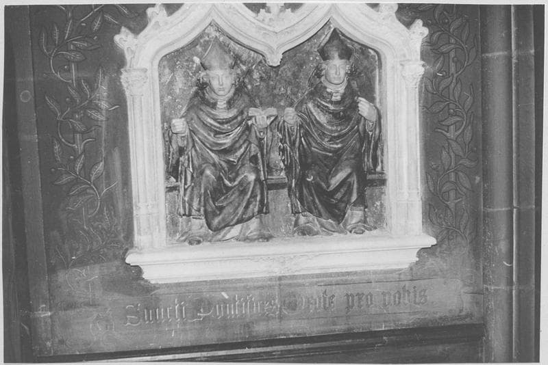 Bas-relief de deux évêques assis. peinture moderne datant de la restauration de 1858. L'ensemble taillé fortement en relief dans un seul bloc, est pris sous un double arc en accolade, se terminant en fleurons et dont les rempants l'ornent de crochets. Latéralement ce décor repose sur deux colonnettes aux chapiteaux fleuris.