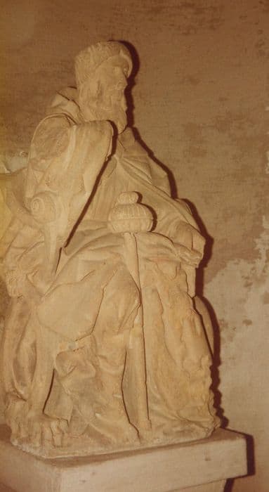 Statue en pierre de Jaumont. Le personnage (peut-être saint Antoine) est assis sur un siège, aux pieds fortement galbés se terminant en griffes de lion. Un petit personnage (diablotin ?) jaillit sur le côté gauche émergeant des plis du manteau du saint, en arrière du pied du siège.