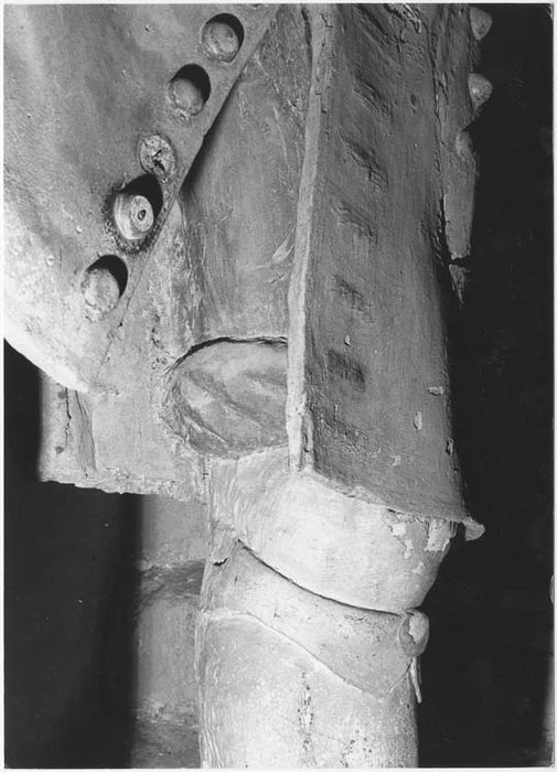 Empoignant de la main droite un énorme bâton, saint Christophe marque un arrêt dans la traversée de la rivière alors qu'il porte sur l'épaule gauche l'Enfant Jésus qui, des deux mains, brandit le globe terrestre. La charge devient écrasante car le saint se trouve obligé de raidir la jambe gauche, d'appuyer la main sur la hanche pour arc-bouter le bras qui fléchit. L'étonnement s'inscrit dans les yeux largement ouverts et dans les traits du visage encadré par une abondante chevelure et un collier de barbe que rejoignent les extrémités de la moustache retombante. Le buste se présente de face alors qu'un mouvement tournant s'exprime dans la jambe gauche ployée. Une longue tunique à col fermé descend aux genoux, boutonnée sur le devant et serrée à la taille par une ceinture étroitement nouée. Les extrémités des manches se relèvent en revers attachés par des boutons. (Eugène Voltz, membre correspondant de la Commission Supérieure des Monuments Historiques, avril 1986).