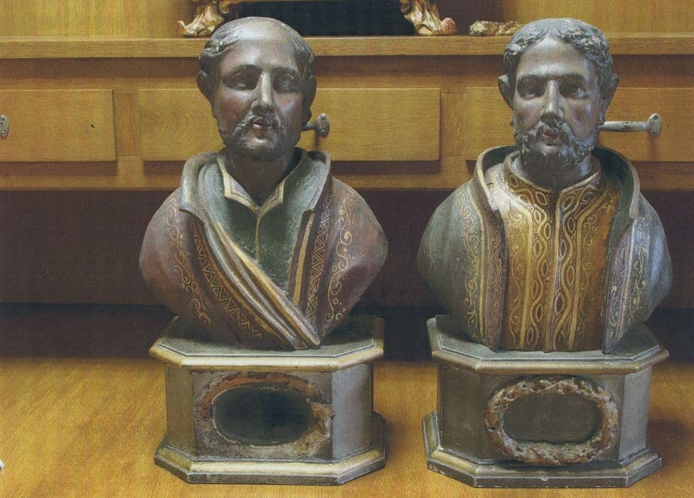 Bustes avec socles destinés à recevoir les reliques. Les ouvertures sont vitrées et ornées de guirlandes dorées (l'une est en partie manquante).