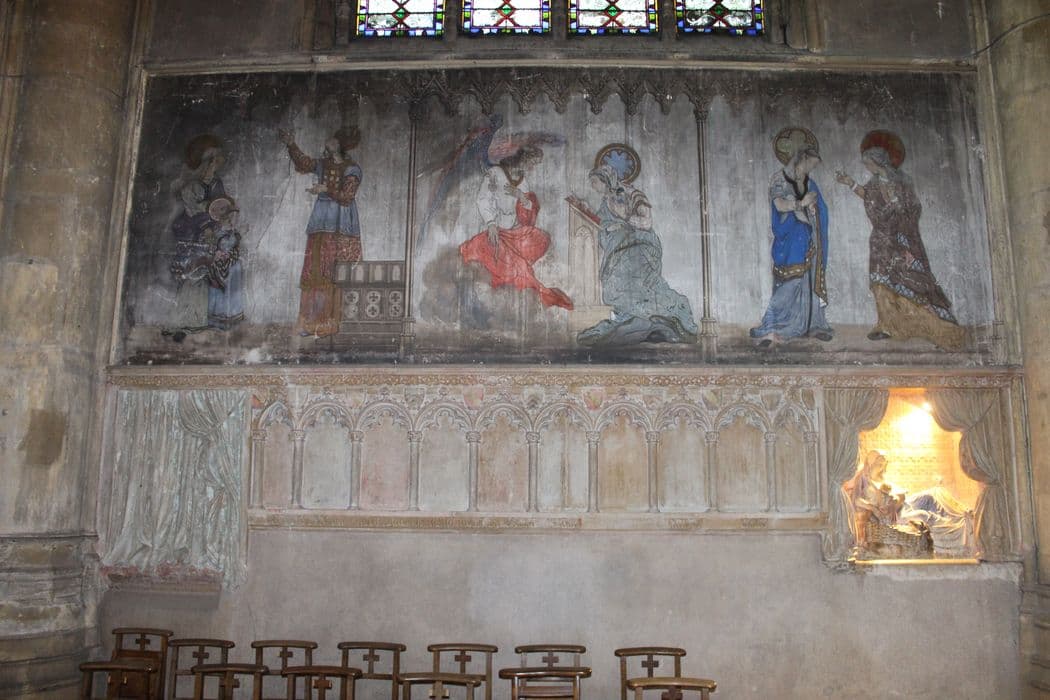 La peinture se développe sur toute la largeur du mur septentrional du transept immédiatement au-dessus du monument funéraire des familles Baudoche de Heu-Gronays. Elle représente trois scènes de la vie de la Vierge encadrées par un décor architectural peint de fines colonettes supportant une frise de dais. Certaines des scènes ont été repeintes au 19e siècle.