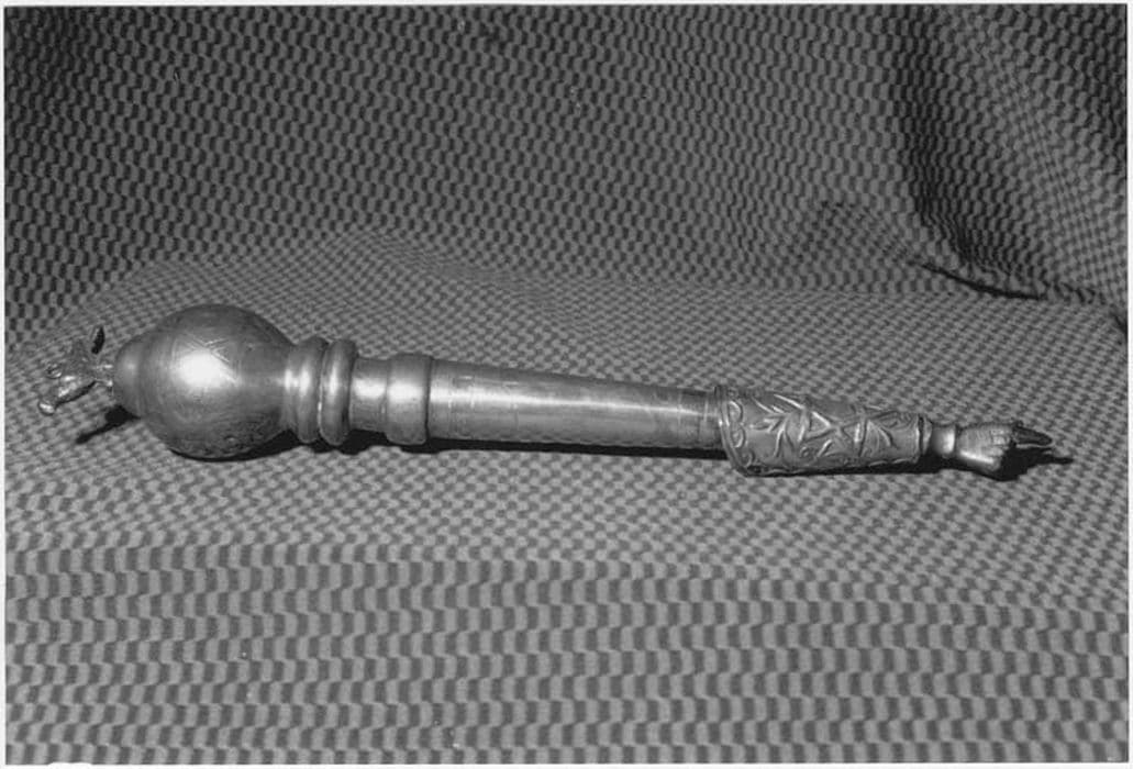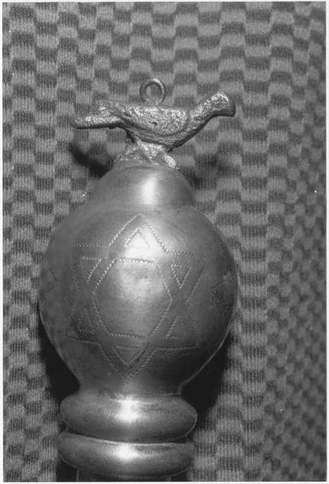 Ce yad comporte la main de lecture fichée au bout d'un manche conique décoré d'une manchette en métal repoussé : feuilles, étoile de David, gravé. Une sphère gravée d'étoiles de David et de motifs floraux termine ce manche. Un oiseau muni d'une bélière sur le dos est posé sur un renflement de cette sphère.