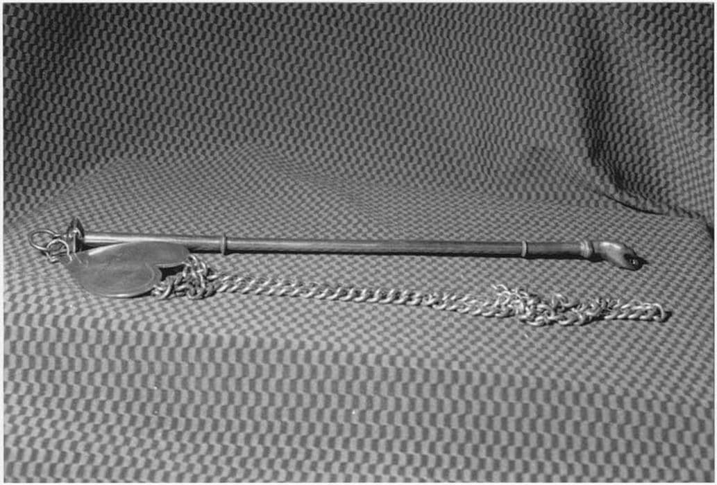 Yad comportant un chaînette et un coeur. La main de lecture est fichée au bout d'un manche tubulaire fin décoré de deux bagues de métal. Une sphère aplatie termine ce manche, muni d'un anneau auquel est fixé le coeur (en argent ?) qui porte une inscription. La chaînette est fixée par des anneaux aux lobes supérieurs du coeur.