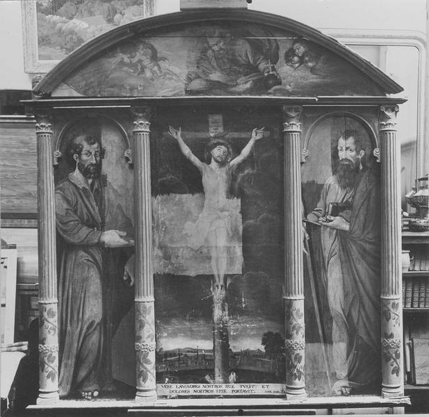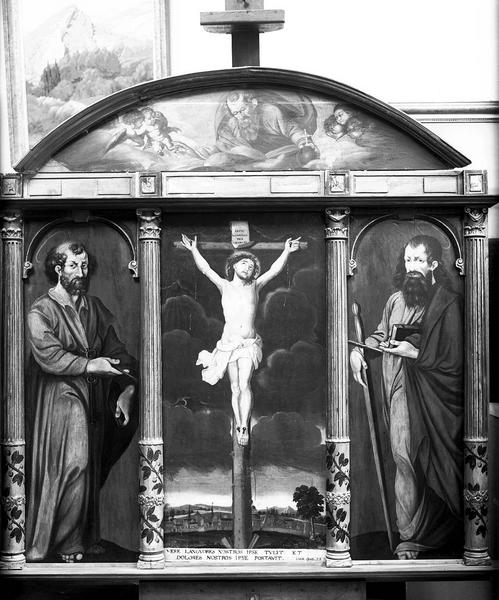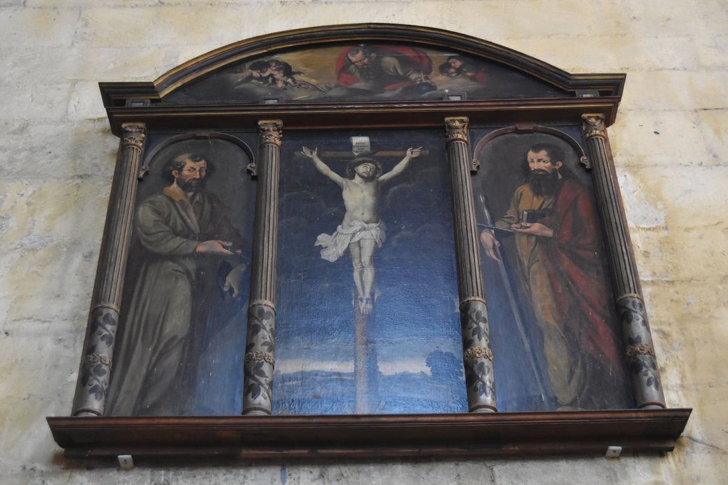 Le Christ en Croix au centre, est peint sur toile. Les deux saints, de part et d'autre, sont peints sur bois. Les trois panneaux sont séparés par des colonnettes en bois.