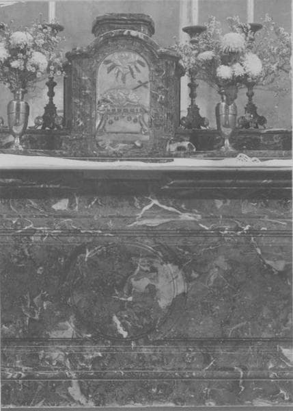 Aux angles de l'autel, il y a une applique de bronze doré. Une autre applique au centre a disparu.