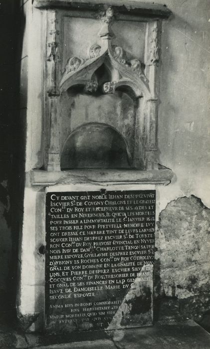 Epitaphe (incomplète) : CY DEVANT GIST NOBLE IEHAN DESPREZ VIVAT : ESCUIER, Sr de COUGNY, CHALONS et LE GRATIEZ, CONer DU ROY et RECEPVEUR de SES AYDES et TAILLES EN NIVERNOYS, IL QUICTA LES MORTELS POUR PASSER A L'IMMORTALITE LE 5e IANVIER 1612 SES TROIS FILZ POUR PERPETUELLE MEMOIRE LUY ONT DRESSE CE MARBRE TINT de LEURS LARMES SCAVOIR IEHAN DESPREZ ESCUIER Sr de TOURTE RON, CONer DU ROY, PREVOST PrVINCIAL EN NIVERNOIS, ISSU de DAMlle CHARLOTTE TENON, SA PREMIERE ESPOUZE, GUILLAUME DESPREZ, ESCUIER, Sr D'AUBIGNY ES ROCHES, CONer DU ROY, COTROLEUR GNAL de SON DOMAINE EN LA GNALITE de MOULINS et PIERRE DESPREZ, ESCUIER SIEUR (DES) COCQUES CONer DU ROY, TRESORIER de F (RANCE) et GNAL de SES FINANCES EN LAD. GEN (ERALITE) ISSUZ de DAMOISELLE MARIE DU C (OING), SECONDE ESPOUZE, ANIMA EIUS IN BONIS COMMORABITU... EIUS HAEREDITABIT TEI... VIATOR MORTALIS QUID SIM VIDE... FUTURUS IPSE QUIS COGI... VIVE UT V...
