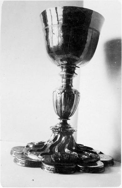 La coupe est ornée de rayons droits et flamboyants alternés. Le pied est festonné et décoré de rayons flamboyants en relief dans l'intervalle desquels sont ciselées des fleurs de lys et de petites rosaces à cinq feuilles. Un des rayons est interrompu par un médaillon du crucifiement. Dans les lobes semi-circulaires du deston, sont gravés des attributs.