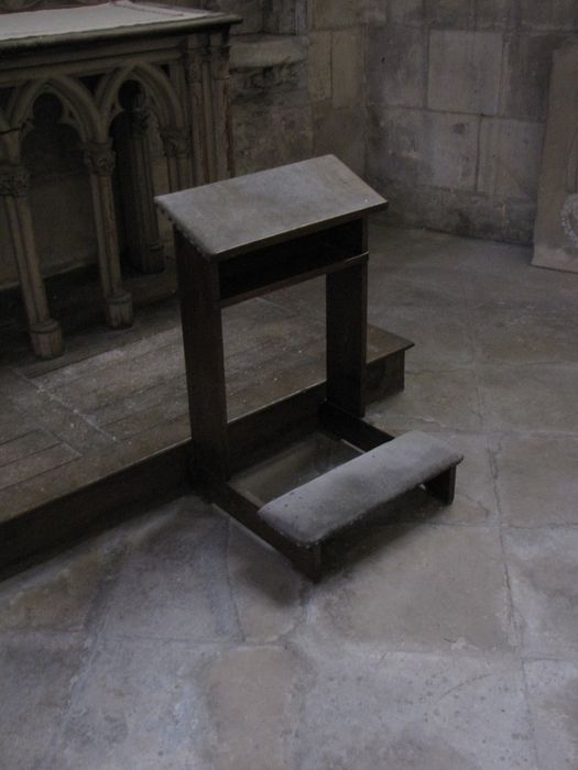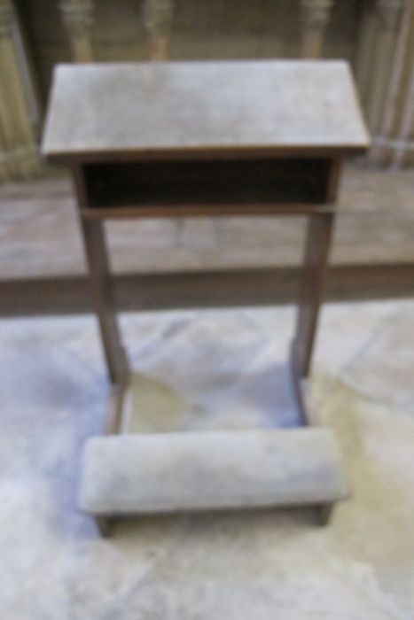 Inventaire 1906 : sièges, n°108, p. 14, prie-dieu à coffret fermant à clef recouvert de velours rouge