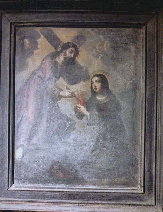 Tableau représentant sainte Catherine de Gênes tenant le Sacré-Coeur que le Christ, portant sa croix, transperce.