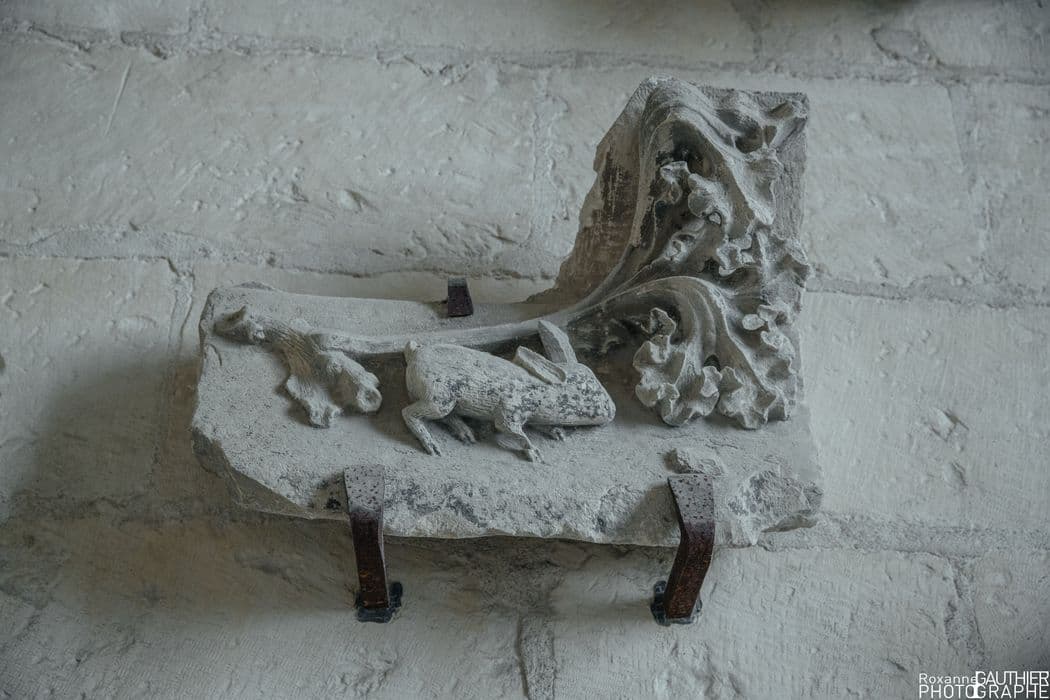 "Coussinet, motif végétal orné d'un petit lapin couché, ornement de l'arcature extérieure d'une des baies des chapelles latérales de la cathédrale Saint-Cyr de Nevers. Elément détruit en 1944 et qui servi de modèle pour la restauration de la cathédrale. Le moulage en plâtre est conservé sous le numéro NBF0132" (Laidet 1983)