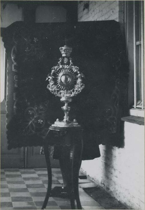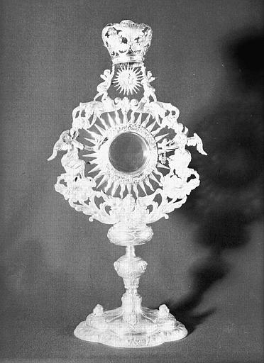 Pied en quadrilobe orné de têtes d'ange. La tige s'épanouit en deux branches où s'agenouillent deux anges. La couronne sur laquelle apparaît un disque solaire est soutenue par deux anges. Au centre : disque entouré de rayons.