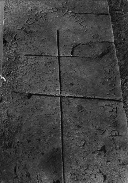 Dalle funéraire avec inscriptions et croix à double traverse gravées.
