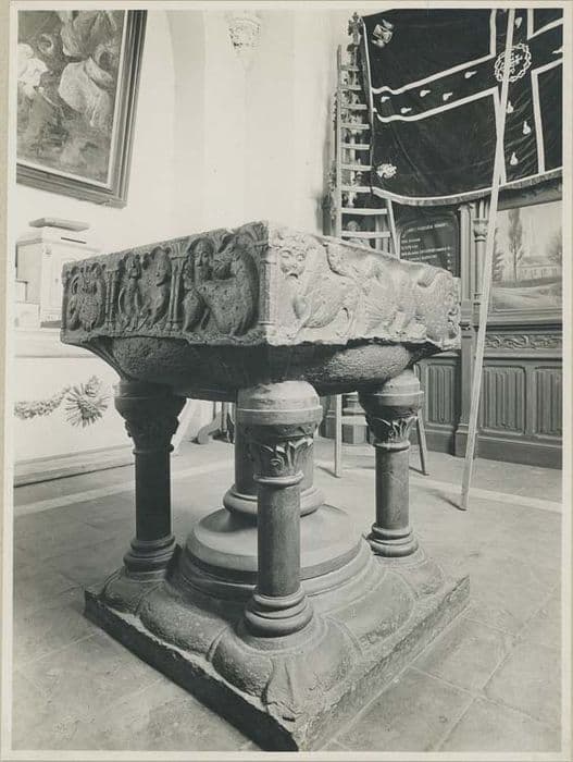 Fonts baptismaux en pierre de Tournai. La cuve carrée repose sur une grosse colonne centrale circulaire et quatre autres plus fines avec chapiteaux et socles.