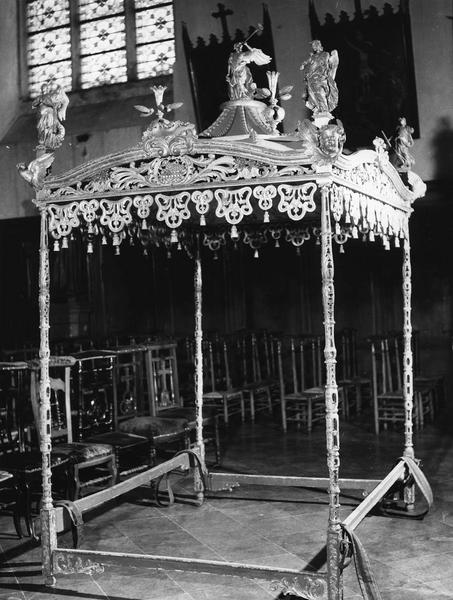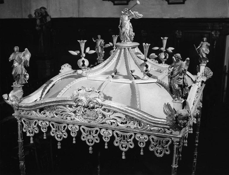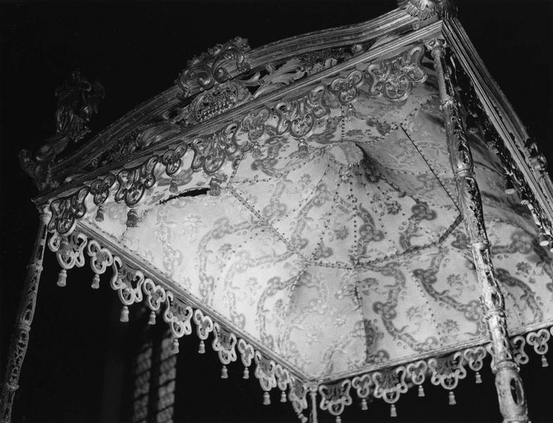 Dais supporté par 4 fines colonnettes sculptées et ajourées et surmonté de 5 statuettes d'anges et de vases contenant des épis de maïs.