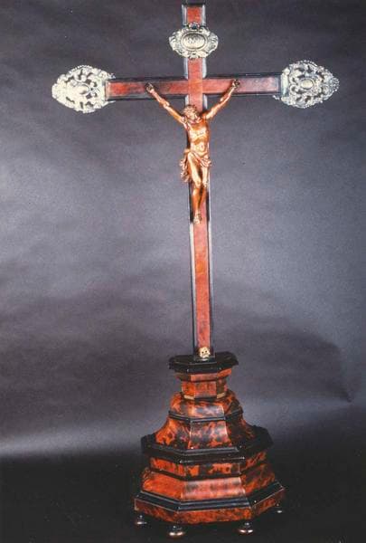Croix et socle plaqués d'ébène et d'écaille de tortue. Figure du Christ en buis et ornements en argent repoussé fixés aux extrémités des branches de la croix, conservés au presbytère, dont il manque l'un des trois éléments.