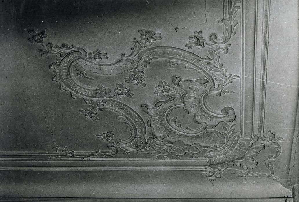 Décor de gypseries ornant le mur nord et trois coins du plafond de la grande salle du rez-de-chaussée de l'aile ouest.