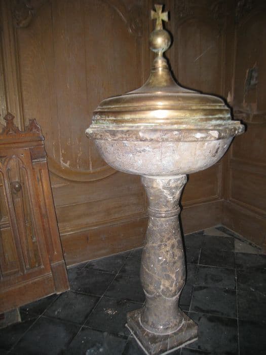 Fonts baptismaux en marbre gris et couvercle en cuivre.