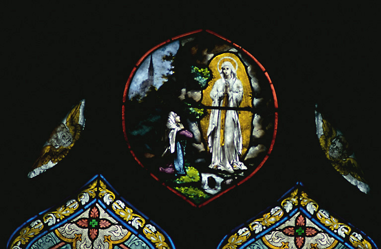 Fragments de vitraux datant du 16e siècle dans les mouchettes du tympan ajouré ; les autres panneaux de la verrière remontant au 19e siècle ne sont pas classés.