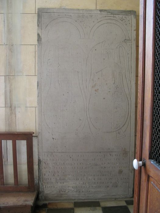 Transcription de l'épitaphe occupant le quart inférieur de la dalle : CY DESSOUS REPOSENT LES CORPS DE VENERABLES ET DISCRETTES PERSONNES MR ANTOINE SIMON / VIVANT PRETRE ET ANCIEN CURE DE NOTRE-DAME / DE PONT L'EVESQUE FUT ENSUITE DIRECTR DES URSULI / NES DE NOYON QUI DECEDA LE 4 FEVRIER 1683 / ET MR ESTIENNE SIMON SON FRERE PRETRE BACHE /LIER EN THEOLOGIE ET CURE DE CEANS ET BIEN /FAITEUR DE CETTE EGLISE QUI DECEDA LE 7 DE IANVIER 1694 TOUS DEUX NATIFS DE NOYON / PRIEZ POUR LEURS AMES