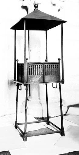 Il se compose d'un support en forme de table, d'un foyer et d'une toiture ne formant qu'une seule pièce. La table est portée par quatre pieds entretoisés de section carrée jusqu'à mi hauteur, puis de section hexagonale. Cette table est munie de deux poignées servant à déplacer le meuble. Sur la table se trouve le foyer en forme de boîte de plan carré dont les quatre faces verticales sont percées d'une série d'ouvertures ressemblant à des fenêtres trilobées. Aux quatre angles de la table se dressent quatre tiges verticales de section carrée qui supportent une toiture pyramidale de base carrée amortie par un ornement sphérique. A l'intérieur du foyer une boîte mobile est destinée à recevoir les braises de façon que vider le foyer est une opération facile.
