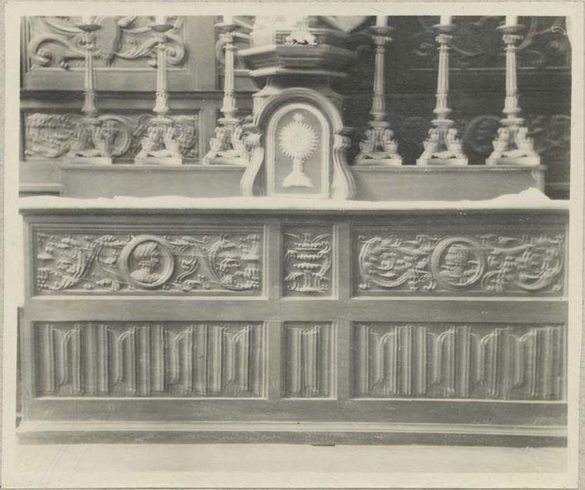 L'autel est composé de panneaux de bois taillés, assemblés et cirés. Ces panneaux sont décorés de bas-reliefs.