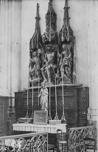 Le retable est composé de trois statues chacune placée sur une base rocailleuse et sous un haut dais architecturé de style gothique flamboyant. Le dais central placé au-dessus du Christ est plus haut que les deux latéraux. Au centre, le Christ, portant la couronne d'épines. De ses mains liées il tient le roseau. A sa gauche, sainte Marguerite foulant le dragon. Elle a les mains jointes en prière et tourne son visage vers le Christ. A la droite du Christ, sainte Marthe dompte la tarasque en l'aspergeant d'eau bénite (elle tient un bénitier et un goupillon).