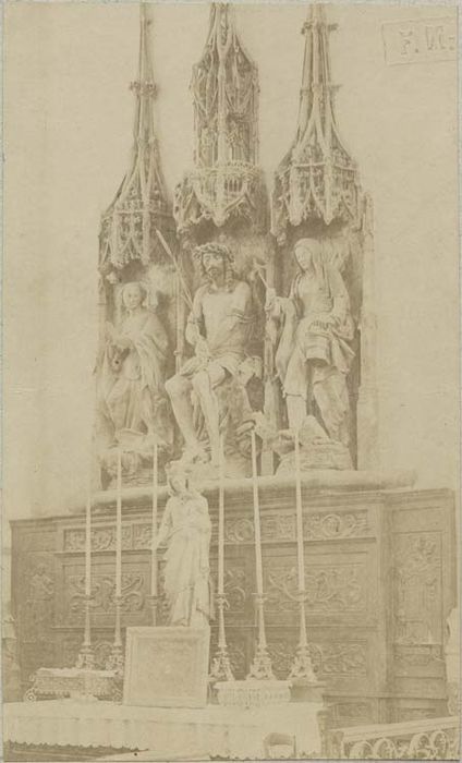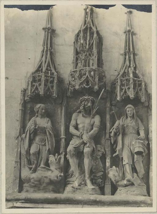 Ensemble de trois statues groupées sur un socle et sous des dais en pierre calcaire sculptée, et peinte. Les statues sont monolithes alors que les dais sont constitués de plusieurs éléments de pierre taillés et assemblés de même que le socle.