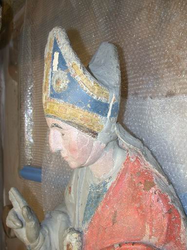 La statue a été entièrement enduite. La main gauche du saint est cassée. Les deux bras de l'un des enfants sont cassés et sa cuisse est endommagée.