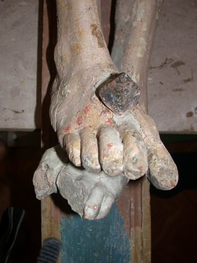 Polychromies anciennes sous-jacentes, recouvertes au 18e ou 19e siècle d'un surpeint blanc imitant la pierre.