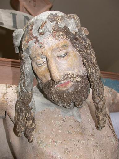 Poutre de gloire composée d'un Christ en croix en trois éléments assemblés (un pour le corps et un pour chaque bras) et de deux statues, la Vierge et saint Jean.