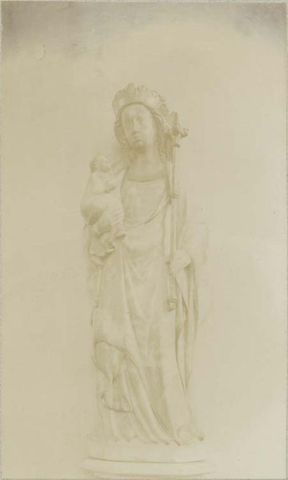La Vierge debout, déhanchée, est habillée d'une robe et d'un manteau ramené en tablier. Elle porte le sceptre de la main gauche et l'Enfant dans son bras droit, ce qui est exceptionnel. Elle est couronnée, mais pas voilée. Ses cheveux longs sont séparés sur son front par une raie centrale. L'Enfant porte une tunique longue. Il lève la tête, regarde sa Mère et tient une pomme.