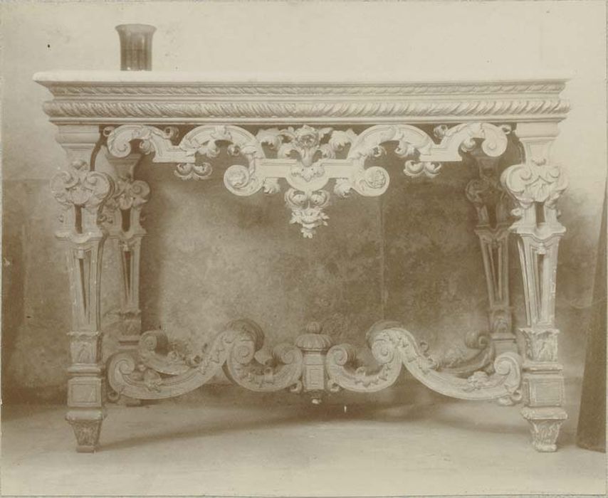 Crédence de style Louis XIV. Une photographie de cette console est conservée aux archives départementales de l'Oise, fonds Jean Bereux, 10 fi 45.