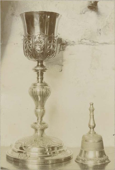 Le calice est en vermeil. Son pied est orné d'oves, de rinceaux, de palmes et de feuilles de vigne, d'épis de blé et d'une croix. Son pied est décoré d'un épis de blé, d'une grappe de raisin. La patène porte pour seul décor le monogramme du Christ. Les deux burettes sont décorées en creux pour l'une de palmes et de roseaux, et pour l'autre de vignes avec des grappes de raisin. Le plateau est orné de pampres de vignes et de roseaux.