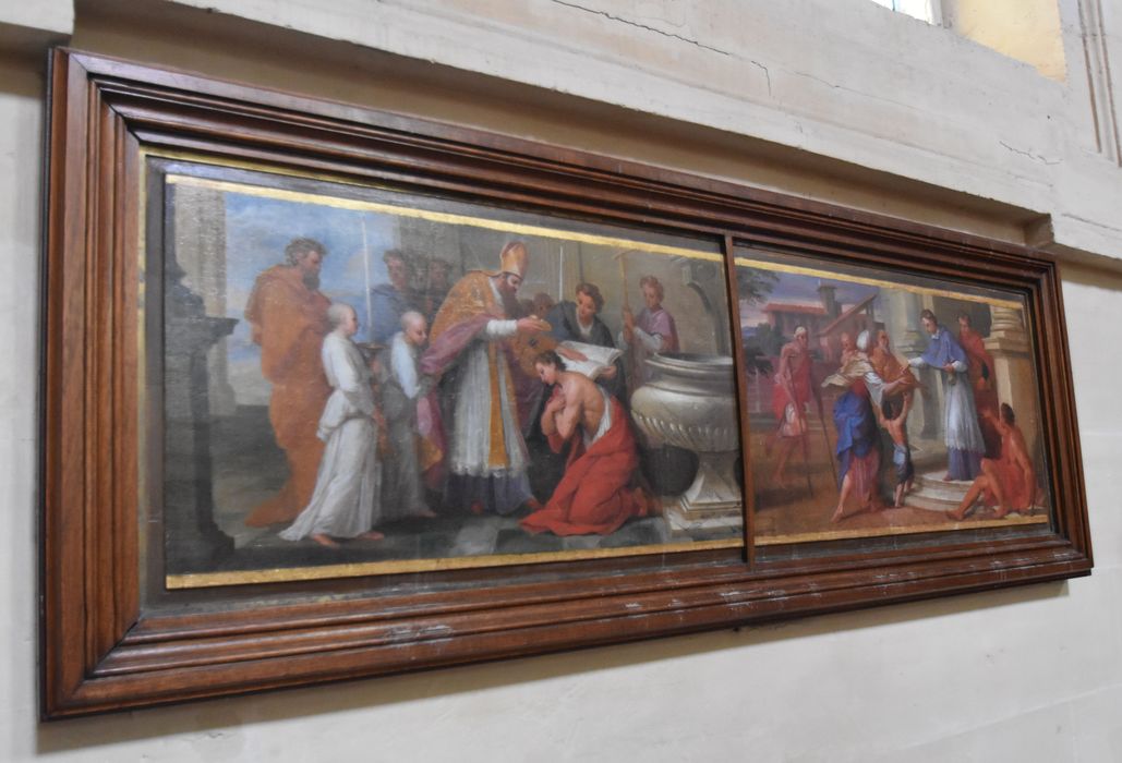 Ces tableaux du peintre Louis de Boullogne datant de la fin du 17e siècle, accompagnaient certainement le panneau représentant la Conversion de saint Hubert dans un ensemble formant prédelle pour les coffres des autels primitifs.