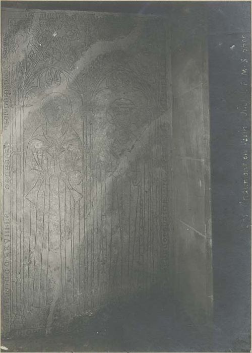 Transcription d'après fiche de documentation du bureau des objets mobiliers : ' Cy gisent Jehan Christian Johanne sa mère qui trespassèrent la dite Johanne l'an MCCCXXXIII IXe jour en novembre et ledict Johan l'an MCCCXXXIII le [...] de la chandeleur, priez pour leurs âmes '.