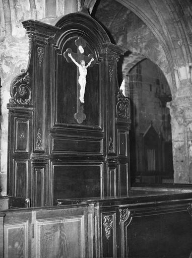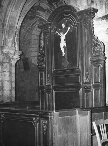 Le banc se trouvait à l'origine face à la chaire. Il a été déplacé lors du remplacement de tous les bancs de l'église et c'est sans doute à ce moment qu'une partie a disparu. Il date du 18e siècle.