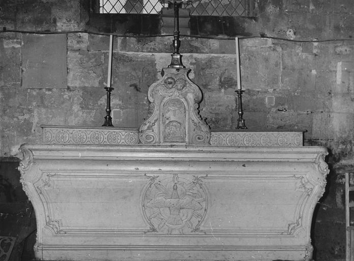 Grand autel tombeau en bois galbé dont les angles sont occupés par des coquilles Saint-Jacques et des guirlandes de fleurs et la face par une colombe du Saint-Esprit dans une Gloire. Le tabernacle à ailerons, sans exposition, est décoré de même manière de volutes et de fleurs surmontées de deux têtes d'anges ailés. La porte est décorée de l'Agneau.
