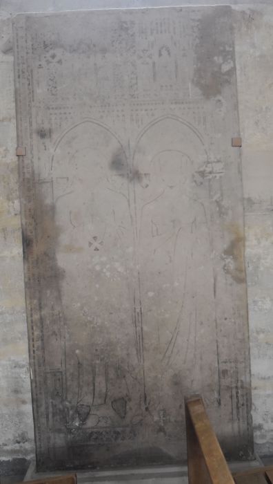 La dalle funéraire porte deux dates : 1400 et 1420. Elle porte aussi cinq croix de consécration qui indiquent qu'elle a été remployée comme table d'autel (deux sont nettement visibles). Elle a pu servir de grand autel avant la Révolution, puisque c'est à cette date qu'elle est mentionnée comme étant déplacée et intégrée au carrelage.