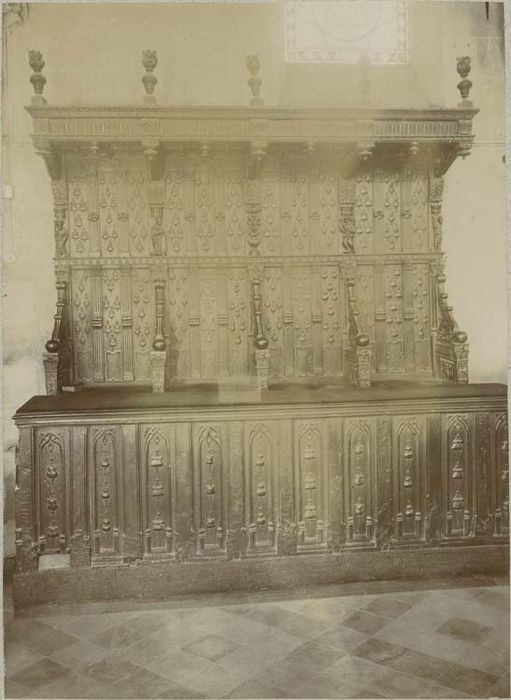 Le banc est daté de 1587. Le décor du banc d'oeuvre (gourdes, besaces, panetières) s'accorde bien avec son emplacement dans l'église Saint-Jacques. Sa décoration est empruntée au vocabulaire de la Renaissance et aussi au vocabulaire gothique (remplages de la partie antérieure du banc).