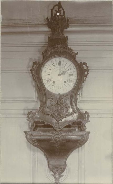 Le cartel et le socle sont stylistiquement homogènes. Le style rocaille du décor autorise à dater l'oeuvre du milieu du 18e siècle. Le cadran porte l'inscription Le Brasseur à Compiègne.
