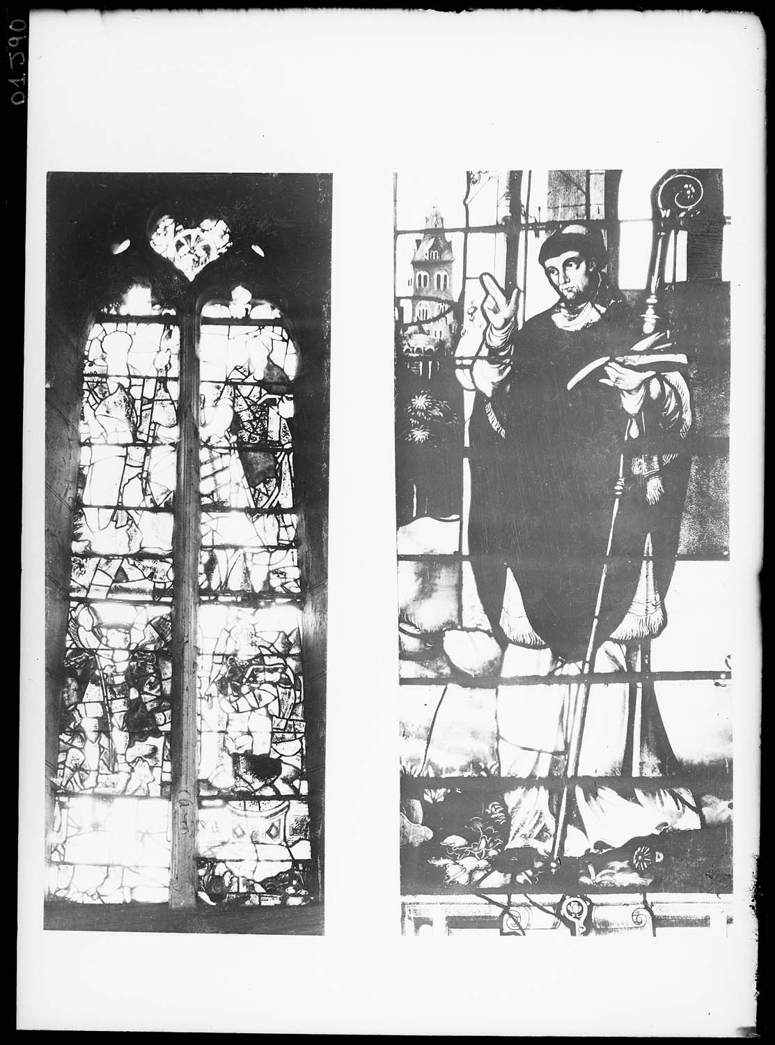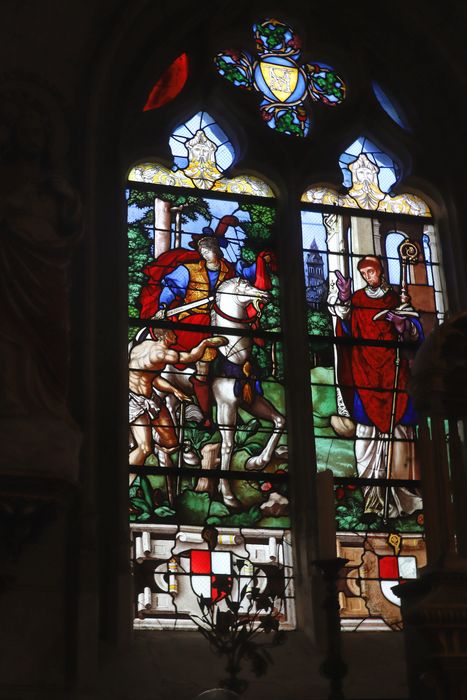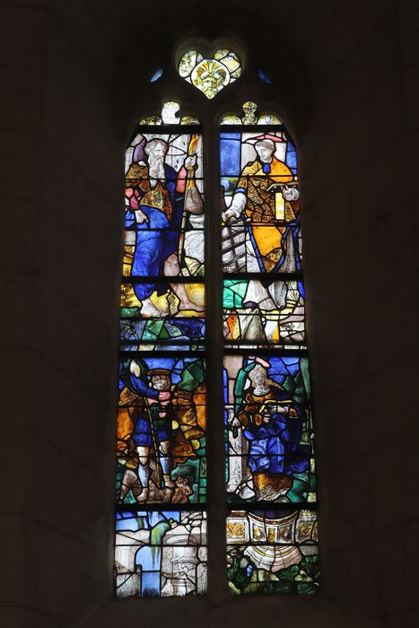 Vitraux en verre coloré, peint avec grisaille et jaune d'argent. Baie 0 : verrière composée de deux lancettes trilobées surmontées d'un quadrilobe. Baie 1 : composée de deux lancettes trilobées avec tympan ajouré.