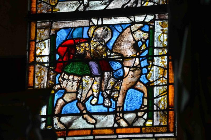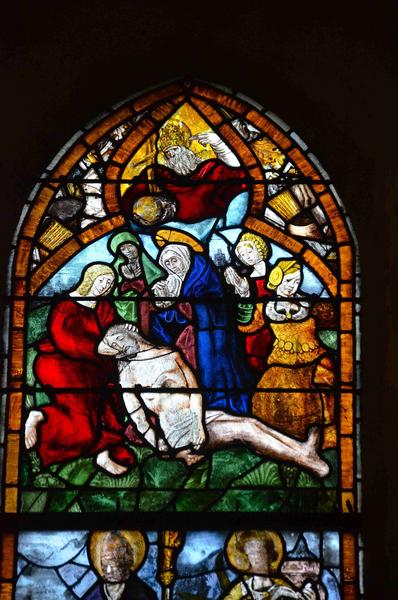 POP | Plateforme ouverte du patrimoineverrière figurée (baie 0) : Saint Nicolas, sainte Barbe, saint Martin, Déploration