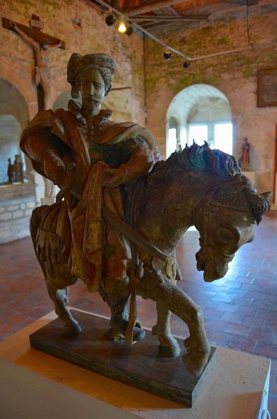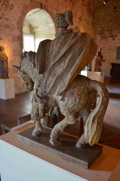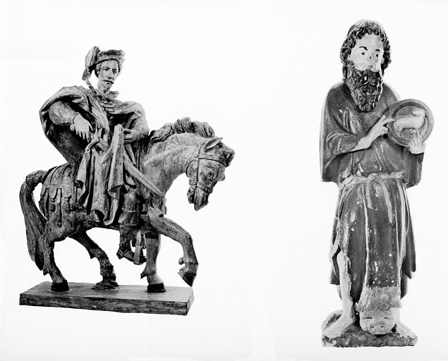 Oeuvre restaurée en 1961. Polychromie complétée. Tête et jambes du cheval consolidées. La figure du gueux est absente.