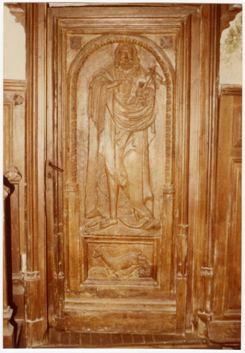 Cette porte fût réutilisée au 19e siècle pour fermer l'entrée de la sacristie nouvellement construite. Le traitement des drapés des vêtements du saint évoque celui des personnages de divers panneaux sculptés de la fin du 16e siècle (notamment le faible relief). Le panneau sculpté peut être comparé à un saint Paul conservé à Fransu dans la Somme. La position du personnage sous une arcature cintrée, fréquente sur les coffres du Beauvaisis entre 1590 et 1620, confirme une datation probable de la fin du 16e siècle ou du début du 17e siècle.
