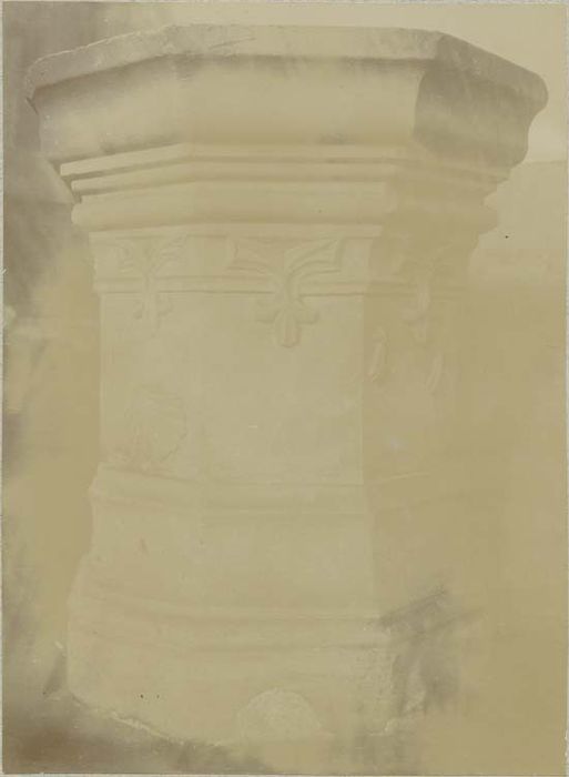Chacune des huit faces de la cuve est sculptée d'un décor feuillagé. Sur quatre faces, deux feuilles épanouies et sur quatre faces, deux feuilles épanouies dont les tiges se joignent et dessinent une fleur de lys. Sur une face, la décoration s'enrichit d'une coquille Saint-Jacques.