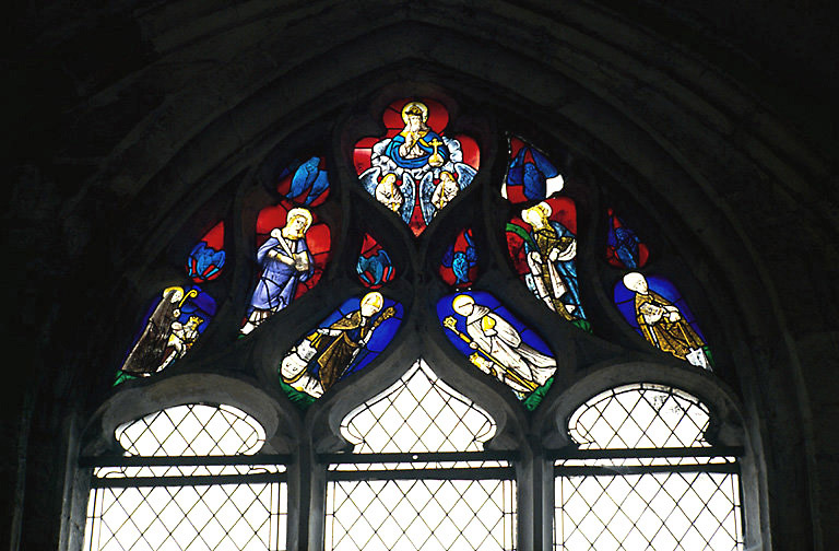 Baie 1 : Dieu le Père entouré d'anges musiciens, sainte Bénédicte et un roi en donateur, saint Eloi, sainte Agathe, saint moine portant la crosse et la mitre avec roi en donateur, sainte martyre, saint Fiacre, angelots ; baie 2 : Résurrection du Christ, saint évêque, saint Jean-Baptiste et ange musicien dans les mouchettes de gauche, saint évêque, sainte Madeleine, sainte martyre, chérubins bleus sur fond rouge et motifs décoratifs dans les mouchettes de droite ; baie 4 : Trinité dans l'amortissement de la lancette de gauche, saint Etienne dans l'amortissement de la lancette de droite, sainte Barbe, ange musicien, chérubins bleus sur fond rouge et scène de martyr dans le tympan ajouré ; baie 5 : motifs décoratifs