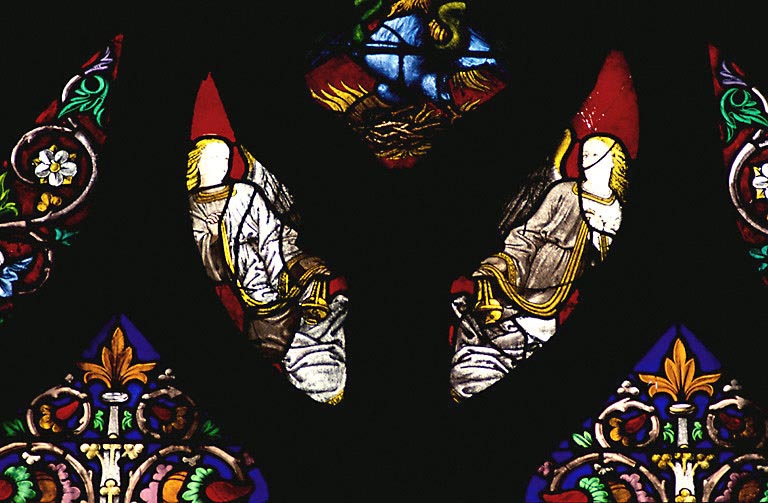 Baie 0 : deux anges thuriféraires. Baie 3 : le pélican et ses petits entouré de deux anges portant une torche. Baie 4 : pélican avec deux anges portants des torches.