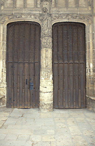 Les deux vantaux de la porte semblent avoir été mis en place au moment de l'achèvement de l'église après 1516. Les médaillons à bustes humains placés de profil sont caractéristiques de la première Renaissance dans la région. Les portes ont été financées par Louis d'Halluin dont les armoiries sont représentées. Compagnon de Charles VIII, il a financé la construction de l'église et est décédé en 1519.