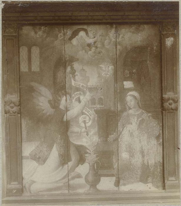 La scène se déroule dans un intérieur avec une fenêtre médiane ouvrant sur un paysage. A gauche, l'ange Gabriel se présente à la Vierge pour lui annoncer qu'elle sera mère. Il présente une banderole avec inscription. Face à lui, sur la droite de la toile, la Vierge tenant un livre et qui esquisse un mouvement de surprise. Au-dessus d'un vase contenant une fleur de lys et placé entre les deux protagonistes, Dieu le Père apparaît dans une nuée avec des anges. Les montants verticaux du cadre représentent des pilastres couronnés de chapiteaux dérivés du corinthien. A la moitié de leur hauteur, l'artiste a placé une fleur décorative.